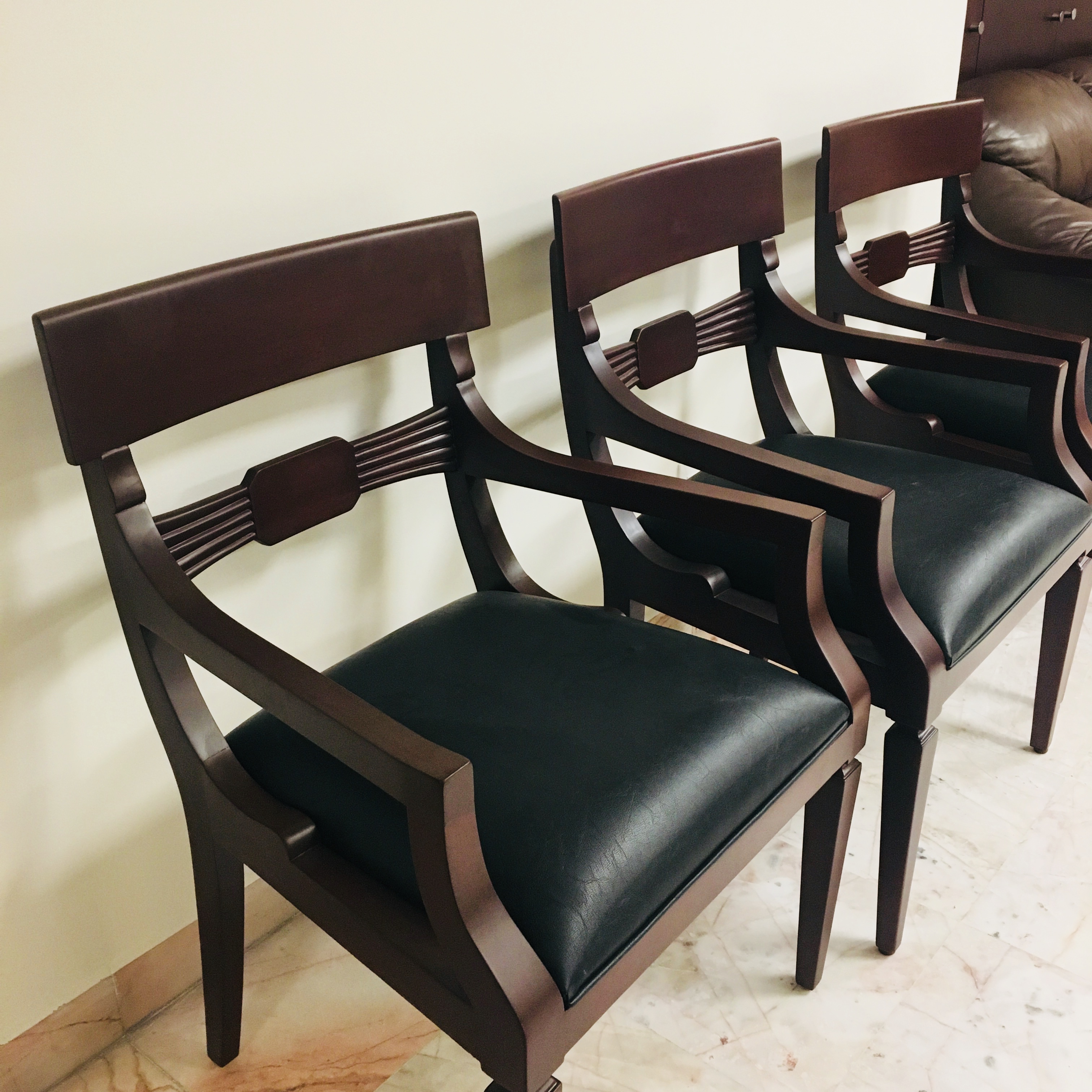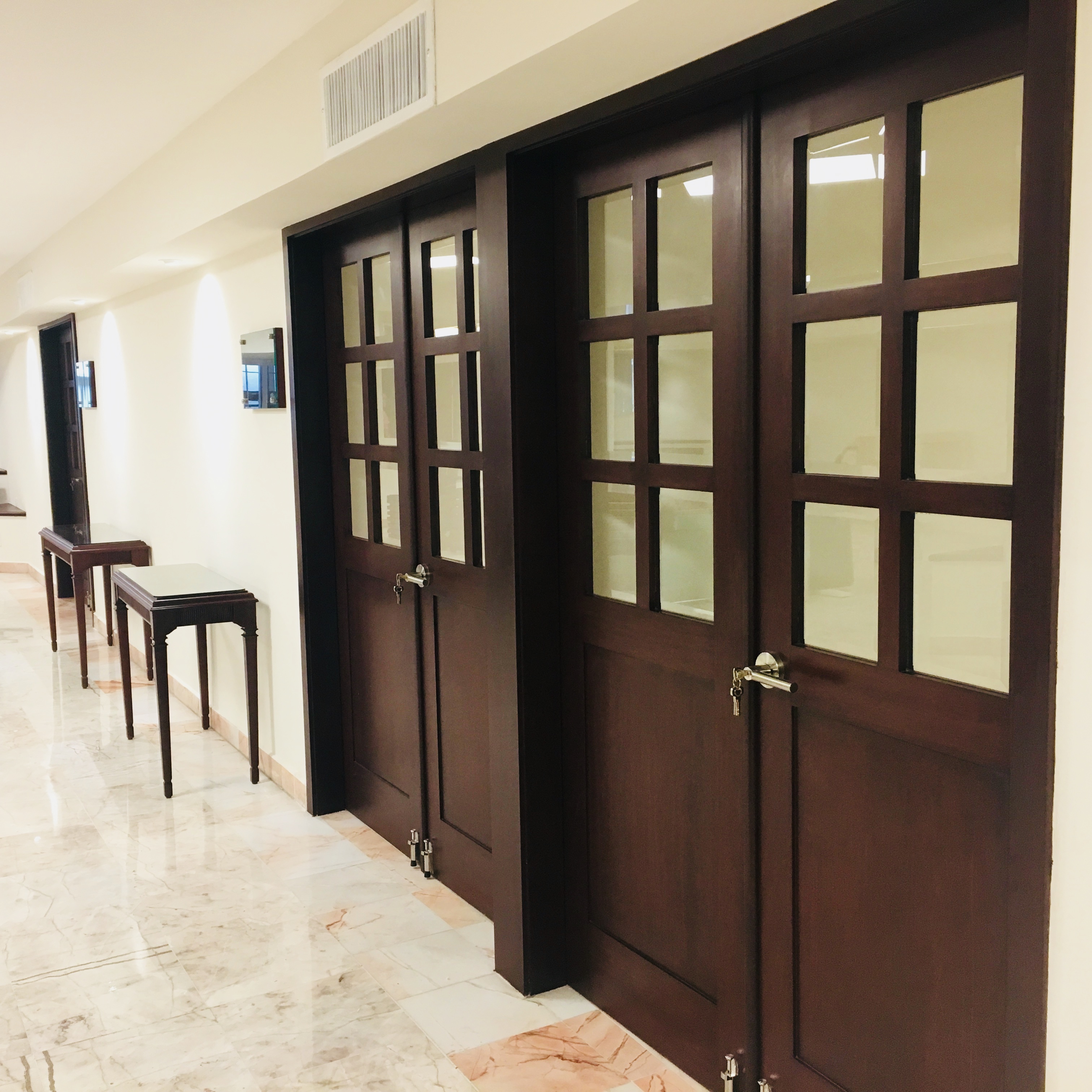 Fabricamos 56 puertas dobles tipo francés que replicamos de las puertas originales, 12 puertas plegables contiguas, rehabilitamos 46 bancas, 38 mesas de centro y algunas sillas, complementarios con herraje de acero inoxidable, piel en color negro y cerraduras embutidas.