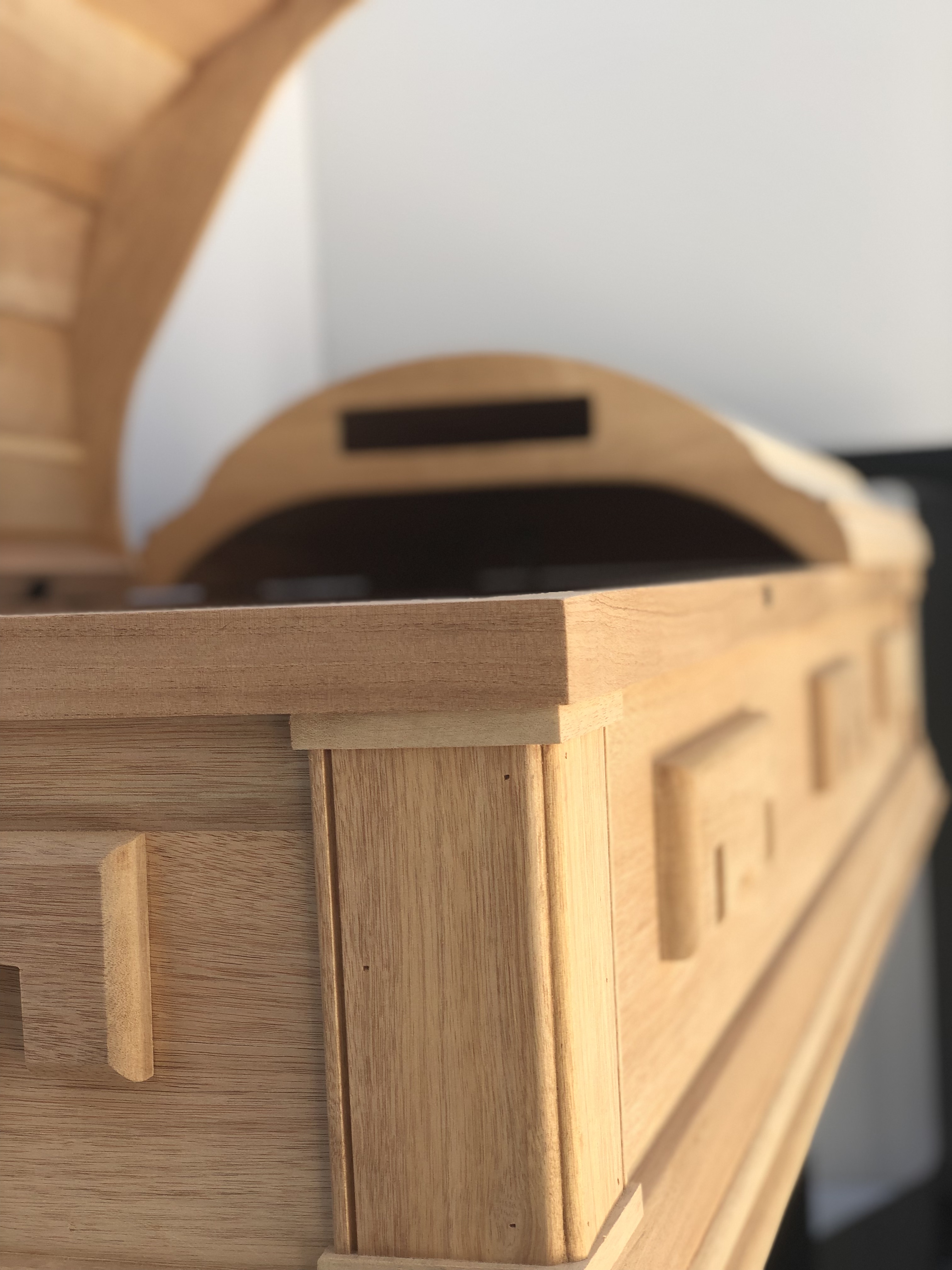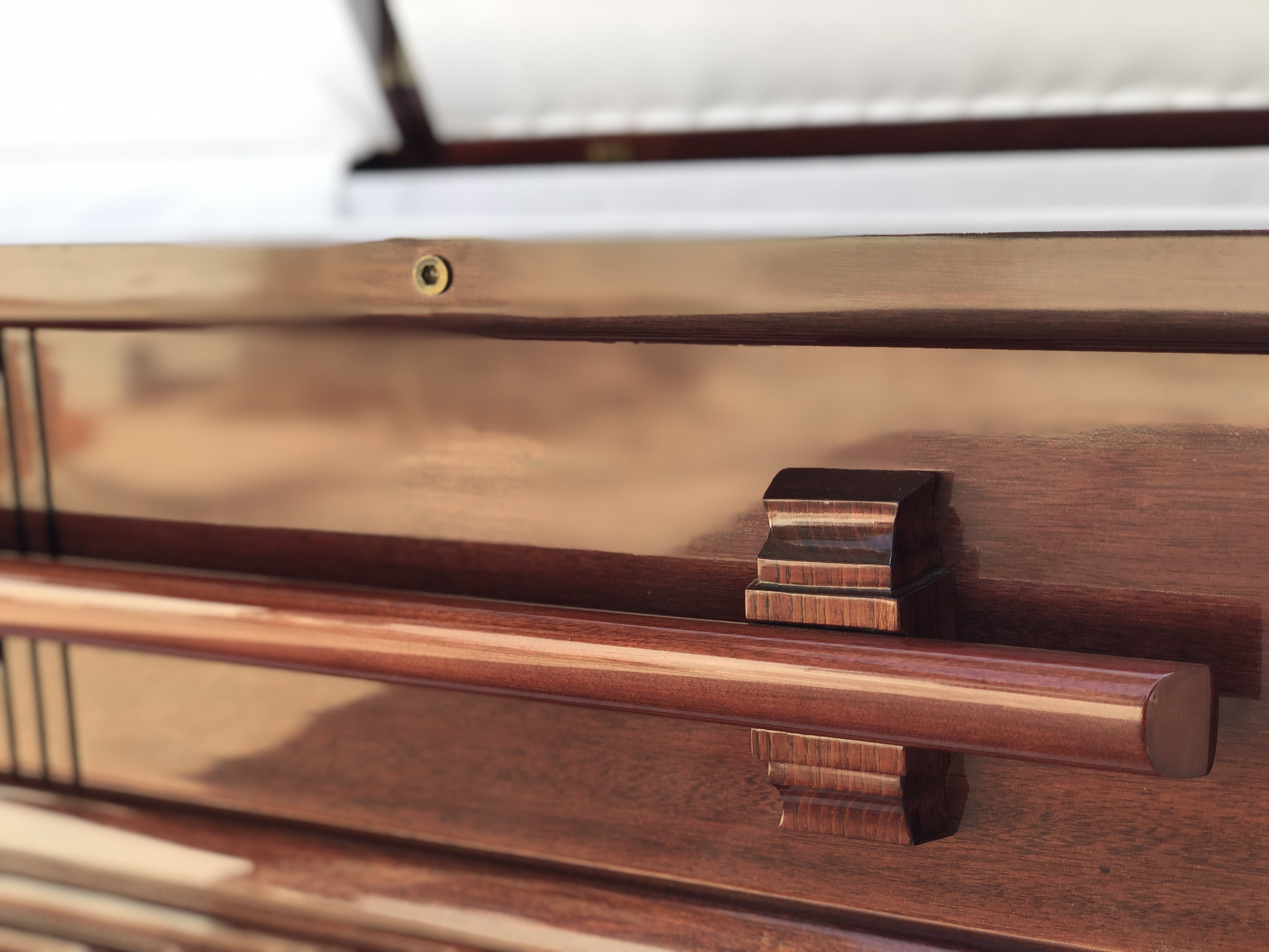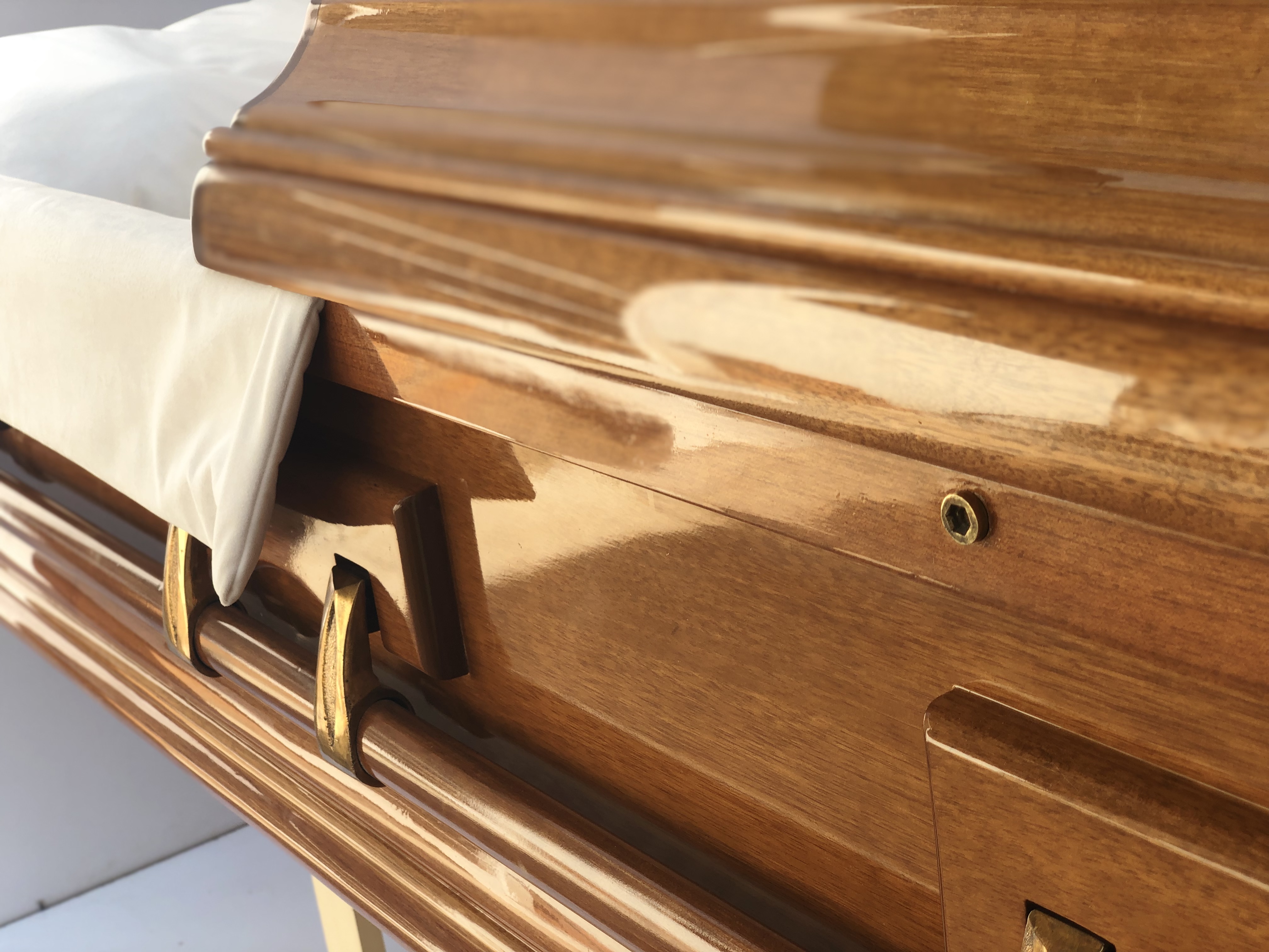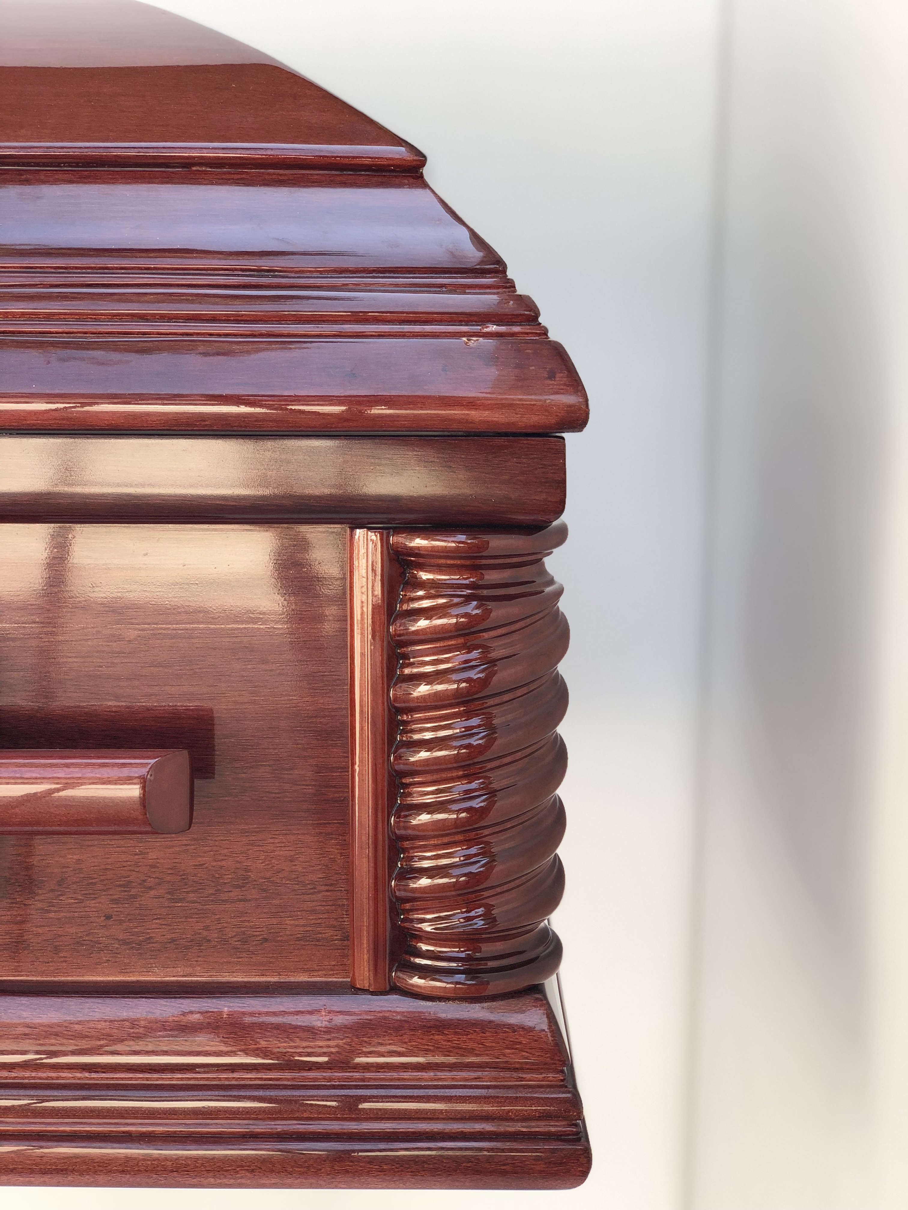 En respuesta a la demanda de ataúdes Premium desarrollamos dos propuestas de ataúdes espléndidos, uno con madera Cherry, ensamblado en una sola pieza, herraje de latón y tapicería ultra suave. Un segundo con madera de encino, piezas torneadas y superficies curvas, ambos elaborados con tablones de madera en una sola pieza y acabado con resina brillante.