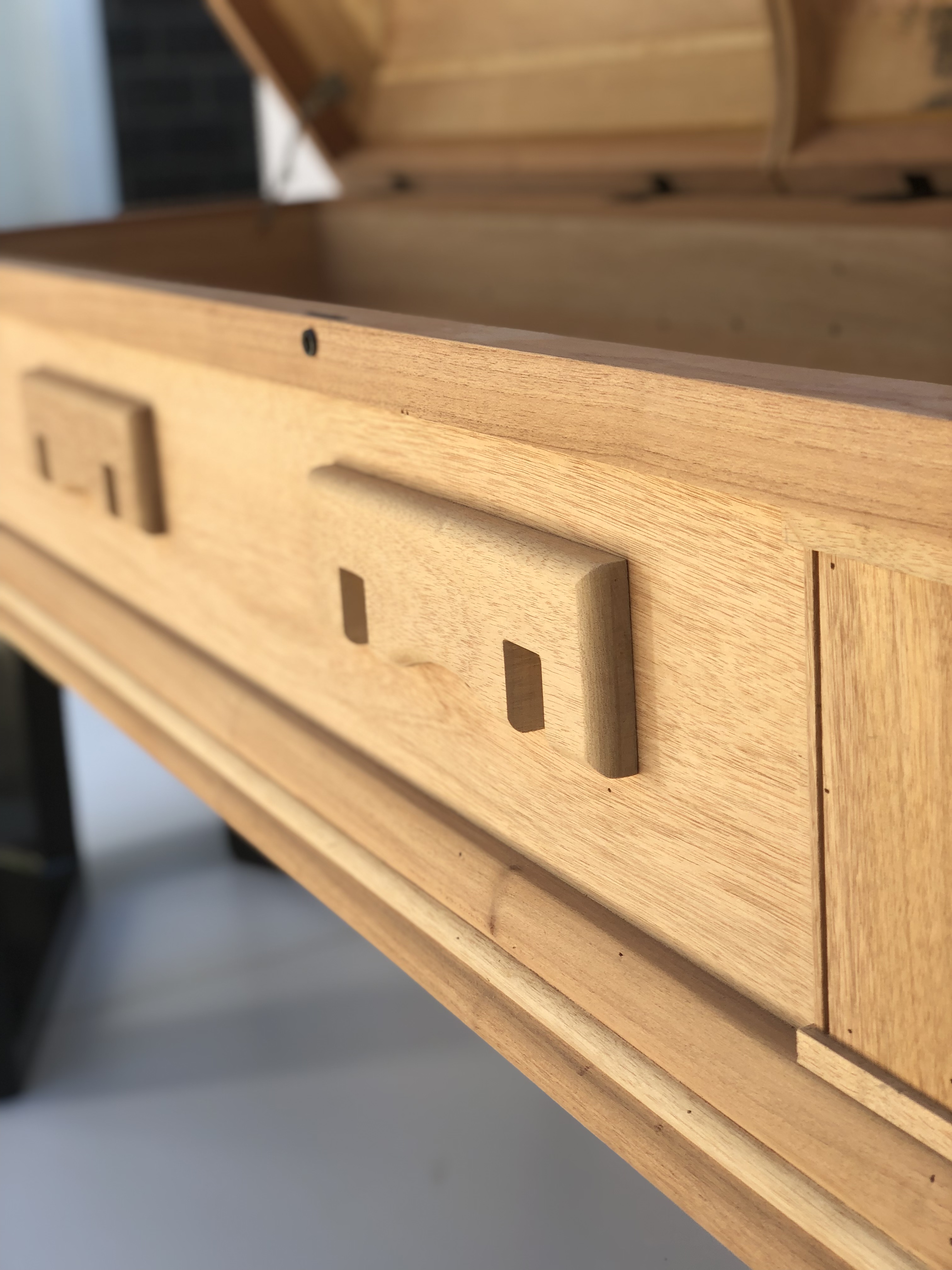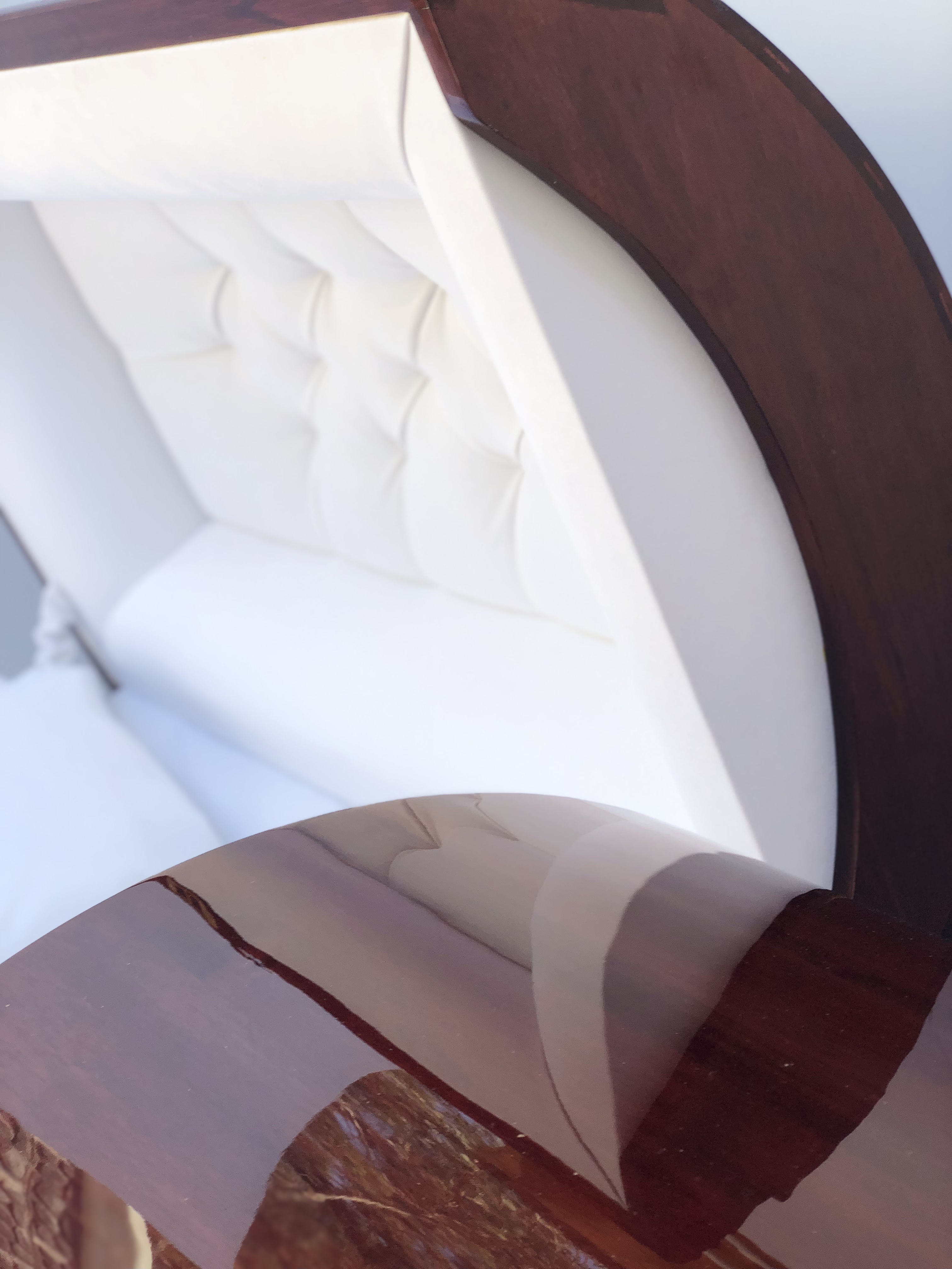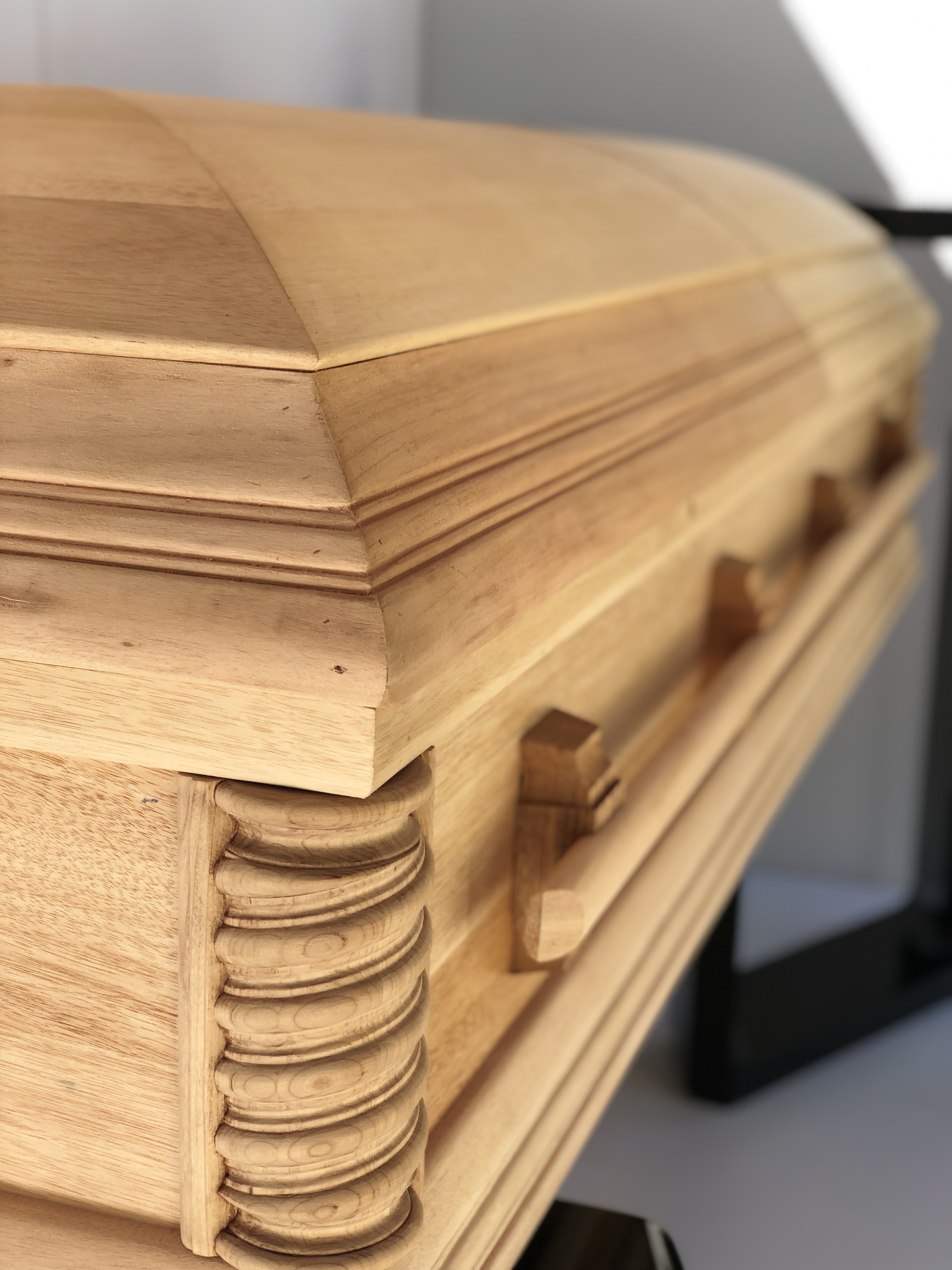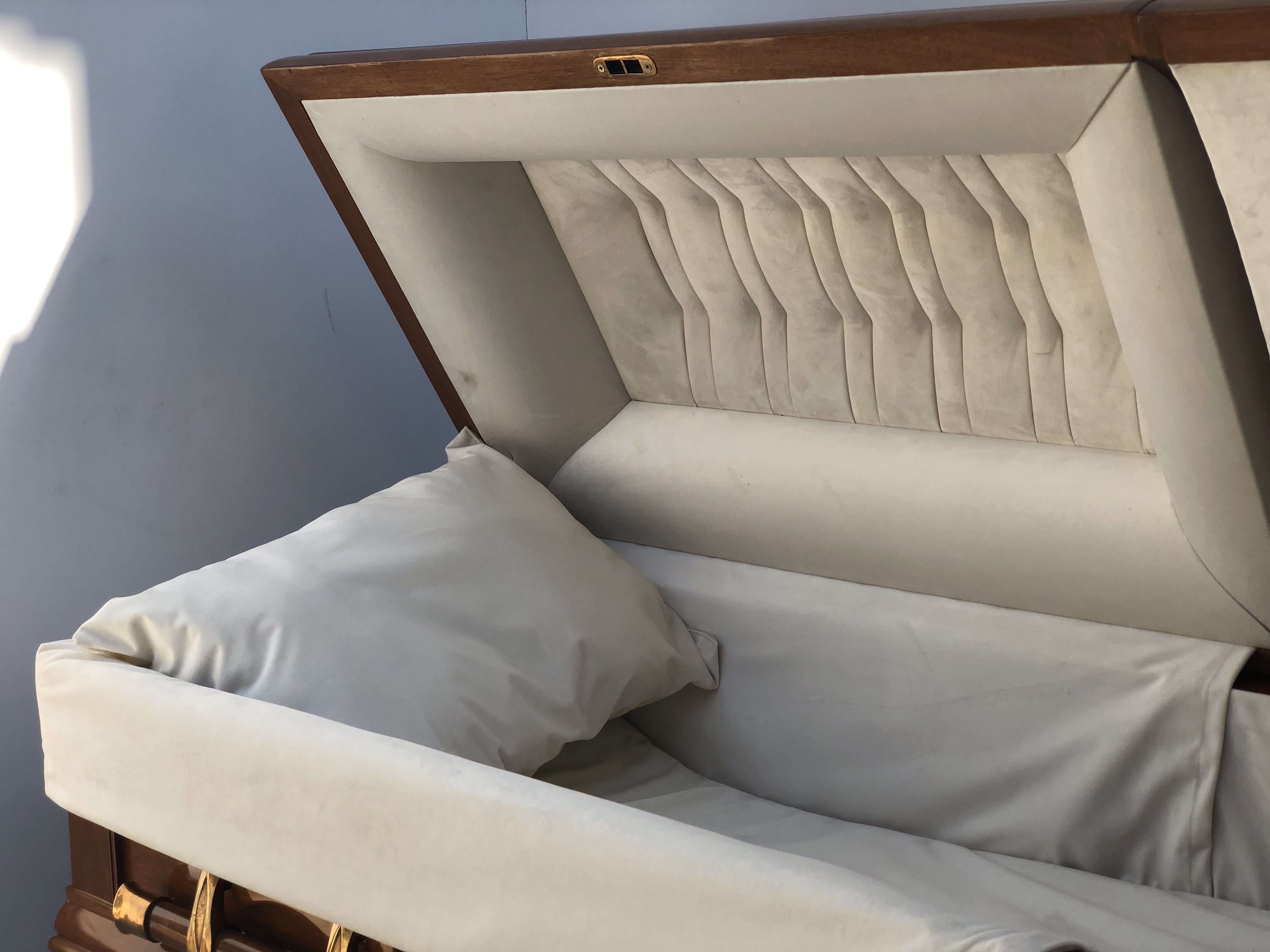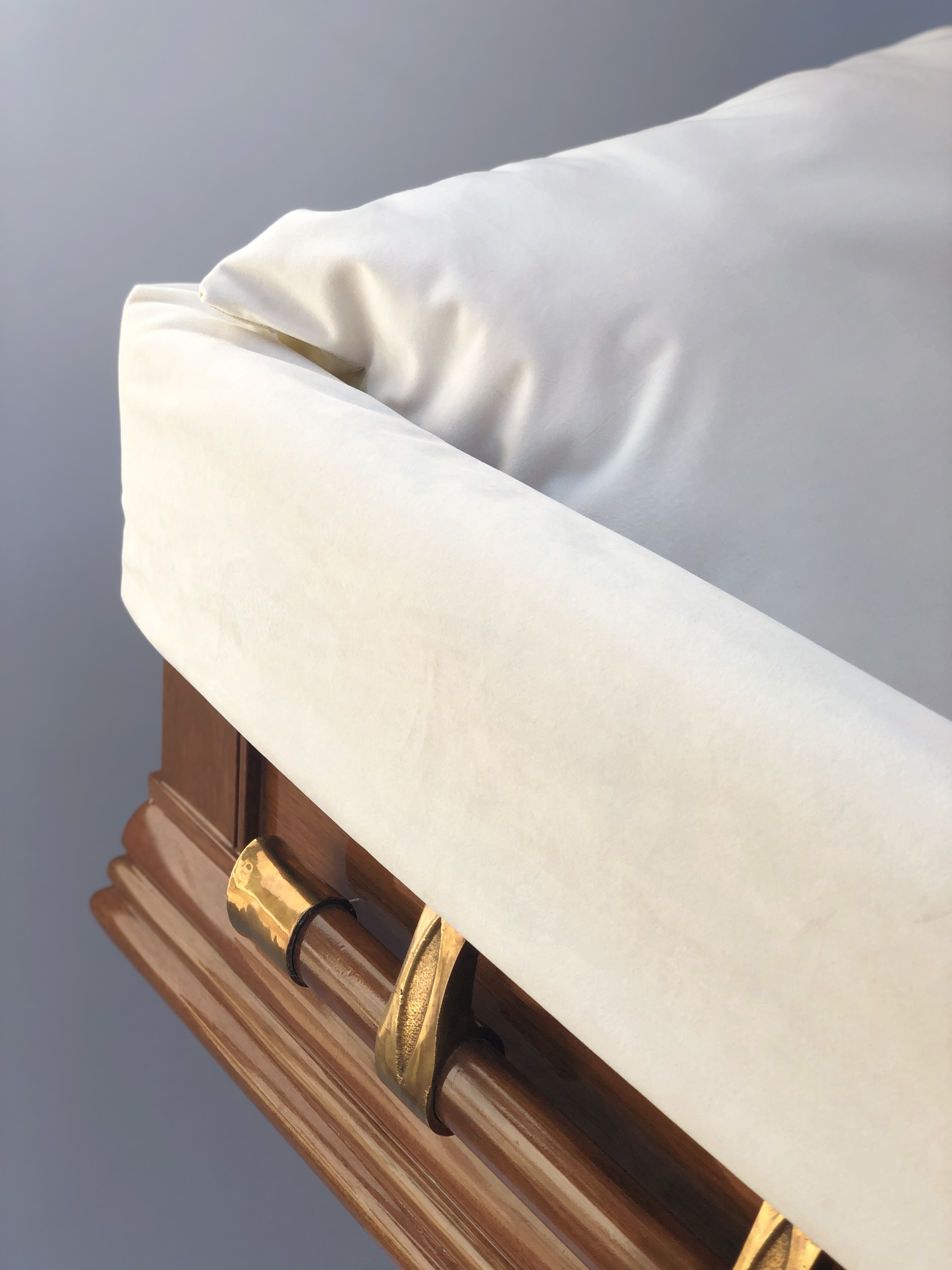 En respuesta a la demanda de ataúdes Premium desarrollamos dos propuestas de ataúdes espléndidos, uno con madera Cherry, ensamblado en una sola pieza, herraje de latón y tapicería ultra suave. Un segundo con madera de encino, piezas torneadas y superficies curvas, ambos elaborados con tablones de madera en una sola pieza y acabado con resina brillante.